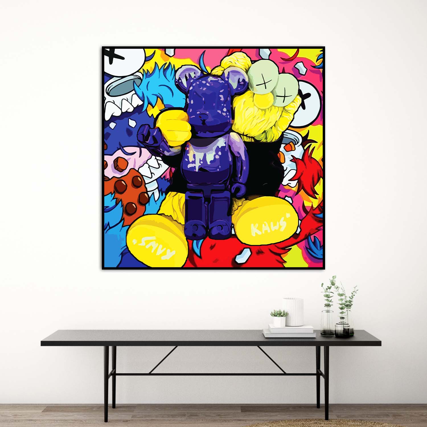 A vibrant and dynamic collage featuring KAWS' signature style, blending playful elements and bold visuals to create a captivating exploration of contemporary art and pop culture.