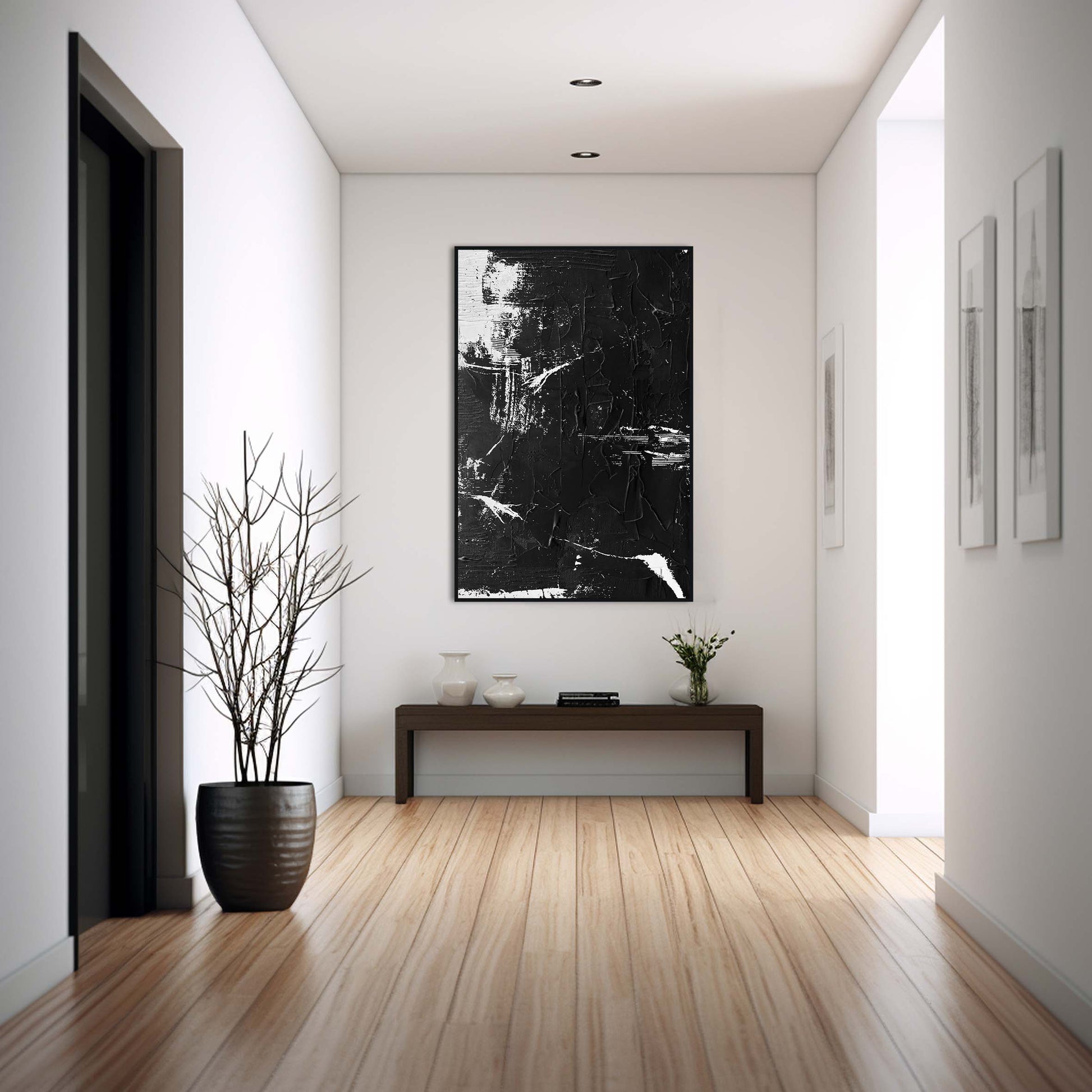 Shadowscape is a powerful monochrome abstraction that explores depth, mystery, and contrast. Layers of textured black dominate the canvas, interrupted by sharp flashes of white that cut through like light breaking into darkness.
